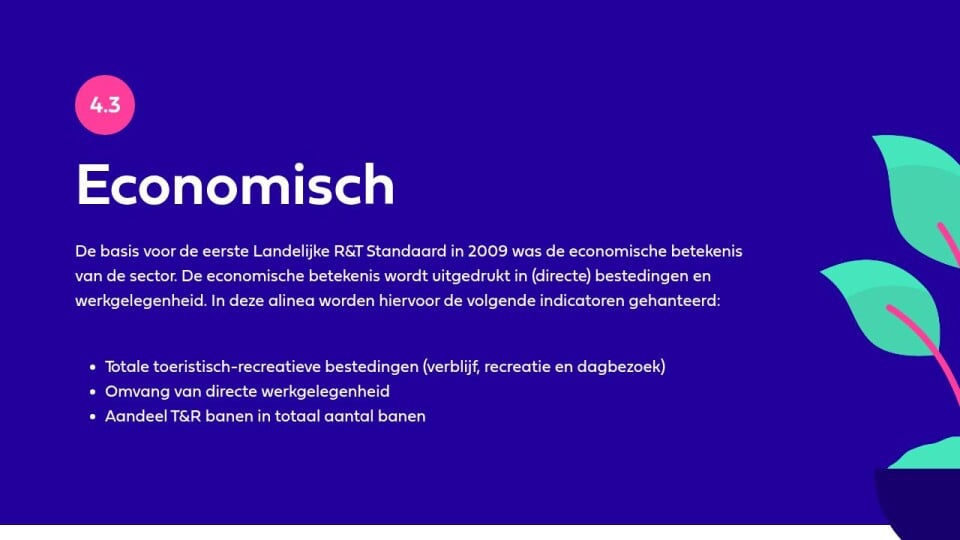 De basis voor de eerste Landelijke R&T Standaard in 2009 was de economische betekenis van de sector. De economische betekenis wordt uitgedrukt in (directe) bestedingen en werkgelegenheid. In deze alinea worden hiervoor de volgende indicatoren gehanteerd: