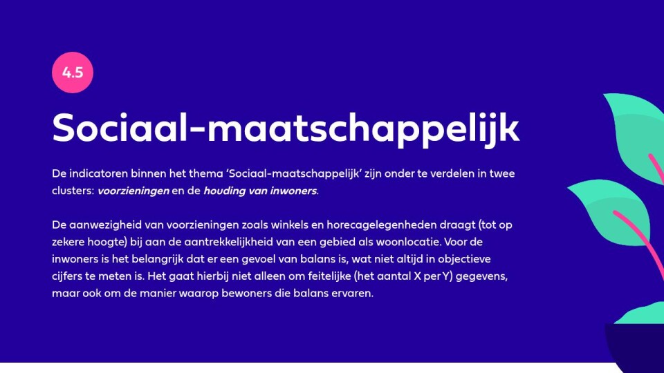 De indicatoren binnen het thema ‘Sociaal-maatschappelijk’ zijn onder te verdelen in twee clusters: voorzieningen en de houding van inwoners.