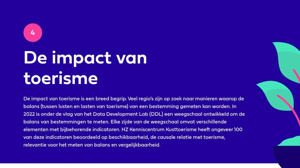 De impact van toerisme is een breed begrip. Veel regio’s zijn op zoek naar manieren waarop de balans (tussen lusten en lasten van toerisme) van een bestemming gemeten kan worden. In 2022 is onder de vlag van het Data Development Lab (DDL) een weegschaal ontwikkeld om de balans van bestemmingen te meten. Elke zijde van de weegschaal omvat verschillende elementen met bijbehorende indicatoren. HZ Kenniscentrum Kusttoerisme heeft ongeveer 100 van deze indicatoren beoordeeld op beschikbaarheid, de causale relatie met toerisme, relevantie voor het meten van balans en vergelijkbaarheid.